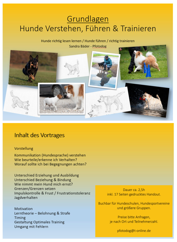 Ich komme zu Ihnen in die Hundeschule oder den Hunde(sport)verein und halte dort Vorträge zu abgesprochenen Themen oder biete Theorie Workshops an! Bei Interesse einfach anfragen. Ein Beispiel: